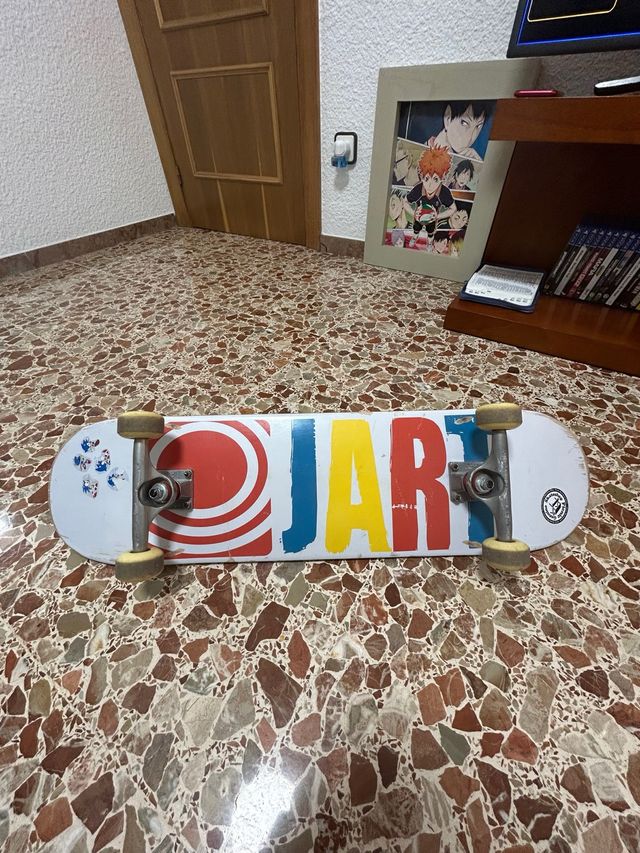 Tabla de skate con un diseño llamativo y colorido. - Diseño frontal JAR con letras grandes y vibrantes. - Ruedas amarillas. - Ejes metálicos.