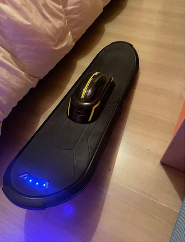 Skate eléctrico SK8 PRO en color negro. Diseño moderno y deportivo. - Luces LED azules frontales. - Detalle deportivo en amarillo. nuevo vale 500