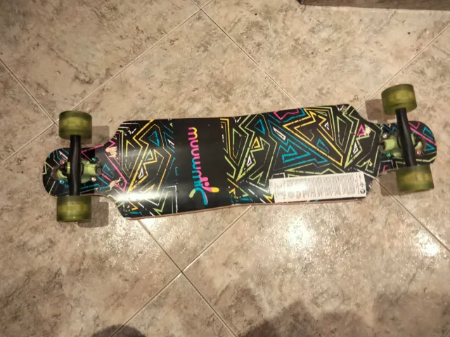 Detalles del productoLongboard de la marca Muuwmi con un diseño geométrico llamativo en colores neón.