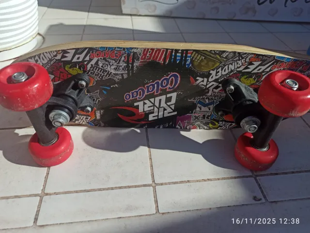 Longboard de la marca Rip Curl con diseño llamativo y ruedas rojas. - Tabla con gráficos de pegatinas. - Ruedas de color rojo. - Ejes negros.