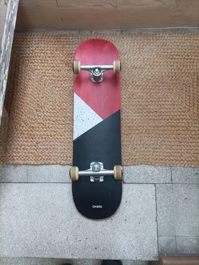 Vendo skate Oxelo prácticamente nuevo. Ideal para principiantes. - Incluye tabla y ruedas. - Diseño bicolor en rojo y negro. - Está en perfectas condiciones.
