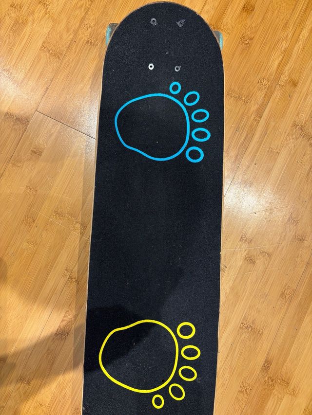 Skate negro con diseño de huellas. - Huella delantera en azul. - Huella trasera en amarillo. - Ideal para iniciarse en el skate.
