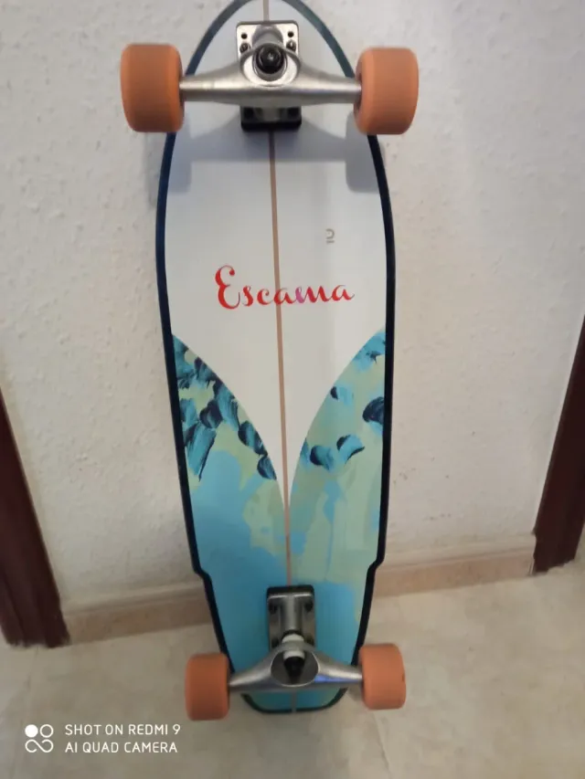 Skate surf de la marca Escama con un diseño llamativo. - Ruedas de color naranja. - Diseño con motivos florales en tonos azules y verdes.