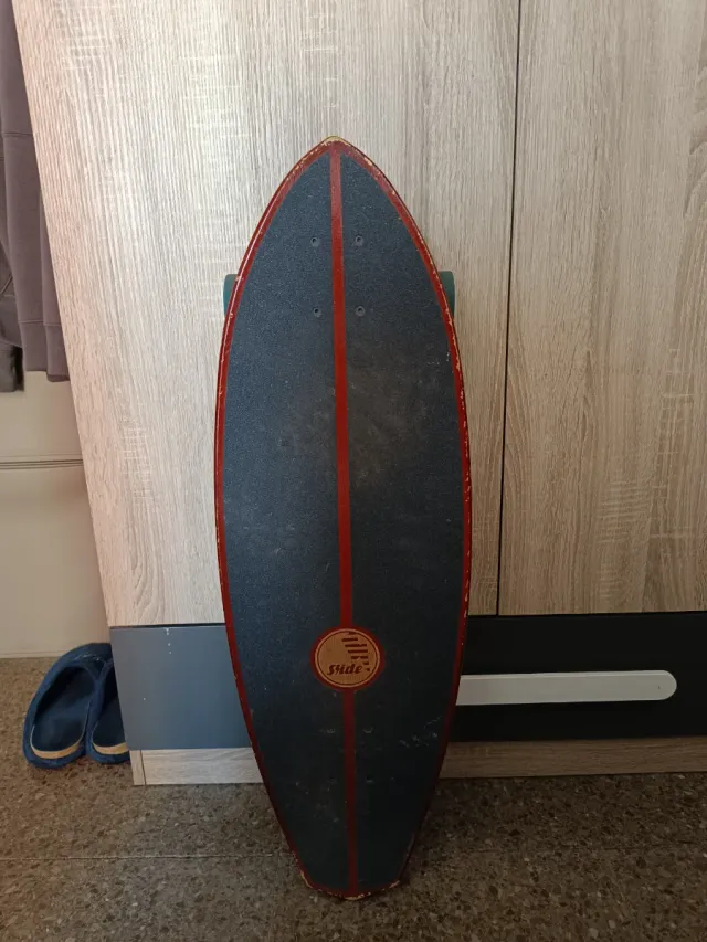 Skate surf de la marca Slide. Diseño con líneas rojas sobre fondo oscuro. Precio negociable - Tabla con lija. - Ruedas verdes. - Logo circular de la marca en la tabla.