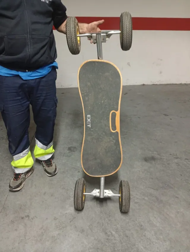 Skate con ruedas todoterreno. - Ruedas grandes para superficies irregulares. - Tabla con lija para mejor agarre. - Asa para facilitar el transporte.