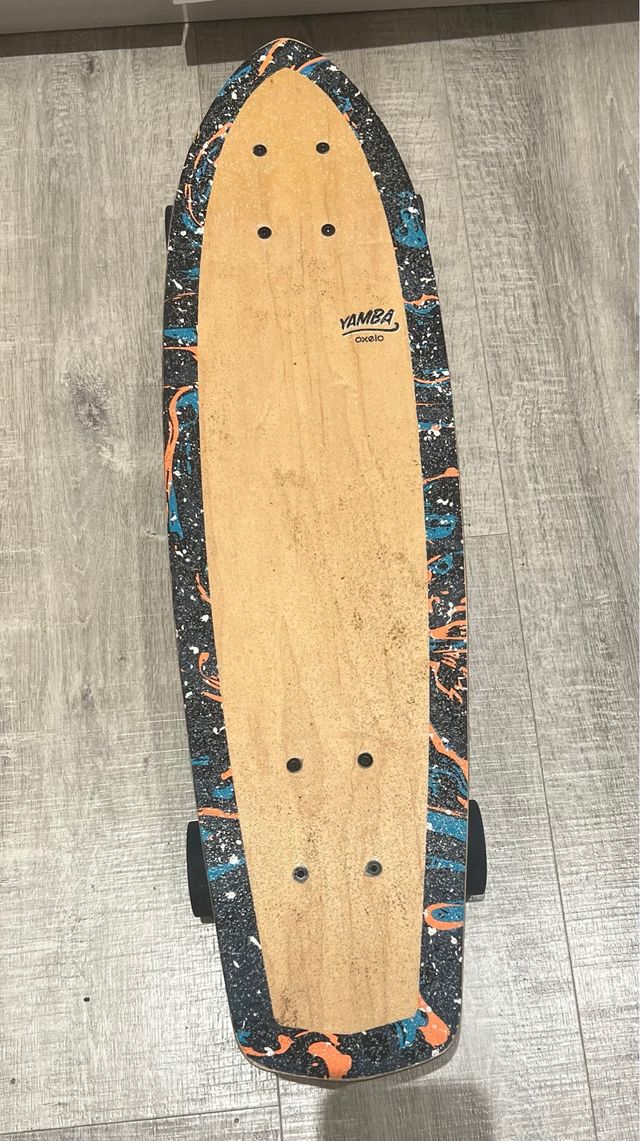 Skate de la marca Yamba, modelo Oxelo. Diseño con detalles en naranja y azul sobre fondo negro. - Tabla de madera. - Ruedas negras.