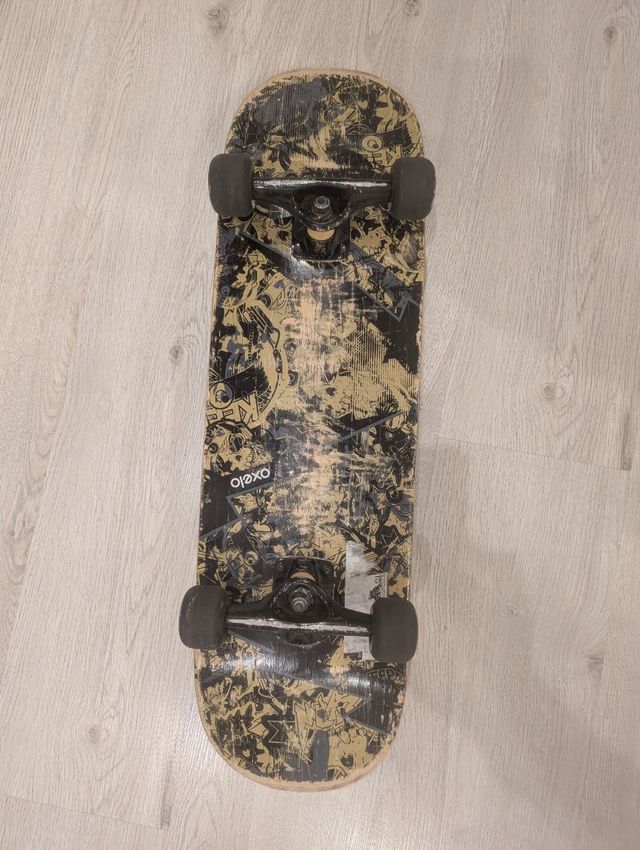 Monopatín Skateboard Oxelo Mid 3 con diseño Skull Gold. Ideal para iniciarse en el skate. - Diseño Skull Gold. - Ruedas negras.
