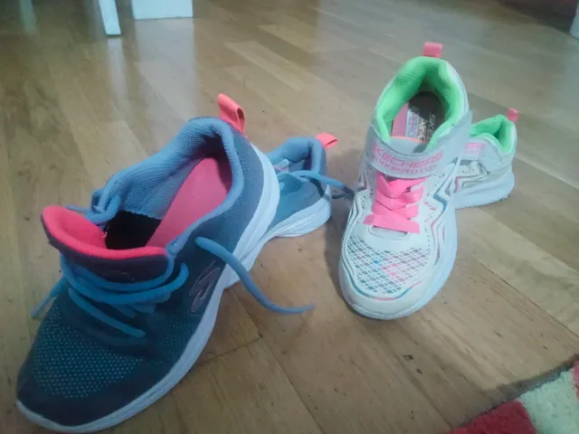 Zapatillas Skechers en talla 27/28. - Modelo deportivo. - Cierre de velcro y cordones. - Combinación de colores azul, rosa y verde.