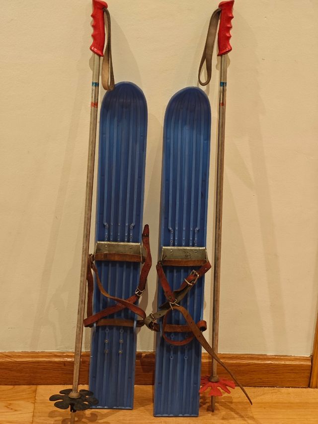 Detalles del productoPrimeros skis para niños, diseñados para caminar en la nieve. Incluyen bastones y fijaciones de cuero.
