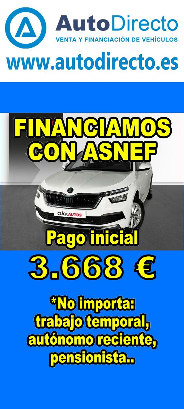Detalles del producto¿No consigues financiación? ¡Tenemos la solución! *************************************************************************** RENT CREDIT: Aprobamos más del 90% de las operaciones. No importa ASNEF o RAI, impagos pendientes, ser autónomo o empresa reciente, ser pensionista. Imprescindible pago inicial del 20%. Ejemplo de operación: SKODA KAMIQ 1.0 TSI 95CV AMBITION. Ref. W957597MFP - Precio vehículo financiado: 18340 €. - Pago inicial de 3668 €. - Cuota mes desde 384 €. - Impuesto de circulación y garantía (mínimo 1 año) incluidos. *************************************************************************** ✅ Más de 3.000 COCHES Y FURGONETAS EN STOCK. ✅ HASTA 2 AÑOS DE GARANTIA. ✅ Kilómetros certificados. ✅ 17 concesionarios repartidos en toda España. ♻️ Aceptamos tu coche como parte del pago. *************************************************************************** IMPORTANTE: -. Este anuncio, no es vinculante, puede contener errores. SE MUESTRAN A TÍTULO INFORMATIVO Y NO CONTRACTUAL. -. Consultar disponibilidad del vehículo y datos exactos: fecha de matriculación, importes, etc,... *************************************************************************** Te ofrecemos distintas opciones: financiación, renting, alquiler con opción a compra, rent credit. En nuestro stock disponible encontraras: 3008 , qashqai , corolla , rav4 , sandero , Duster , yaris , 2008 , Tucson , Ibiza , 208 , Sportage , a3 , c4 , Formentor , q3 , yaris cross , 500 , c3 , arona , zs , x1 , kona , corsa , clase a , león , 308 , serie 1 , golf , focus , captur , a1 , tiguan , i20 , t roc , stonic , xc40 , civic , q5 , serie 3 , glb , 5008 , ateca , clio , kuga , c hr , i30 , arkana , juke , a4 , x3 , cx 5 , xc60 , kamiq , taigo , Mustang , x6 , polo , ceed , karoq , x2 , Astra , niro , cx 30 , a5 , cooper , megane , moka , fiesta , hs , q2 , clase c , serie 3 , renegade , picanto.