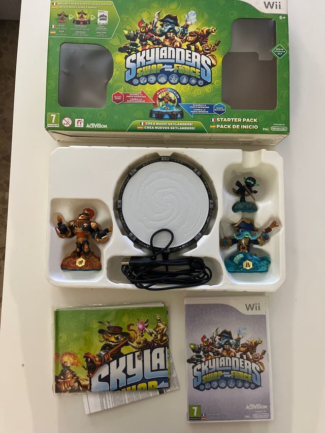 Pack de inicio para el videojuego Skylanders Swap Force para Wii. Incluye el juego y accesorios. - Portal de poder. - Figuras de personajes. - Manuales.