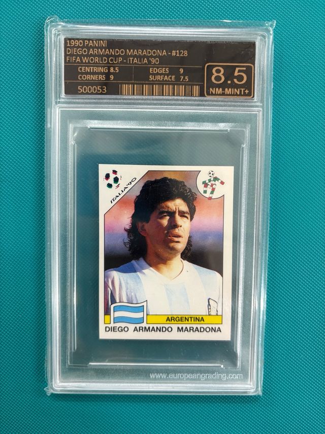 Detalles del productoTarjeta Panini de Diego Armando Maradona del Mundial Italia '90, con Argentina número #128. Graduada con una puntuación de 8.5 NM-MINT+.