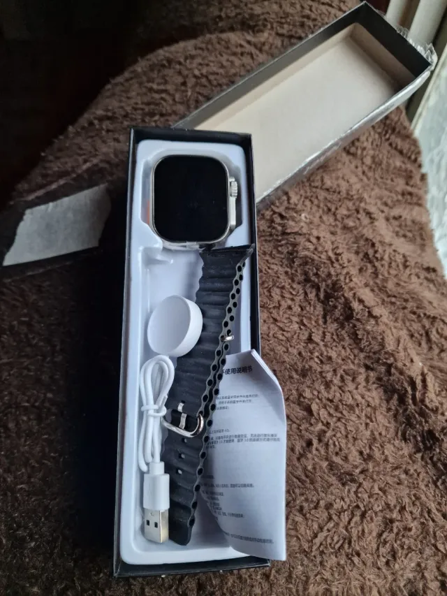 Reloj inteligente con accesorios. - Pantalla cuadrada. - Correa negra. - Cargador USB.