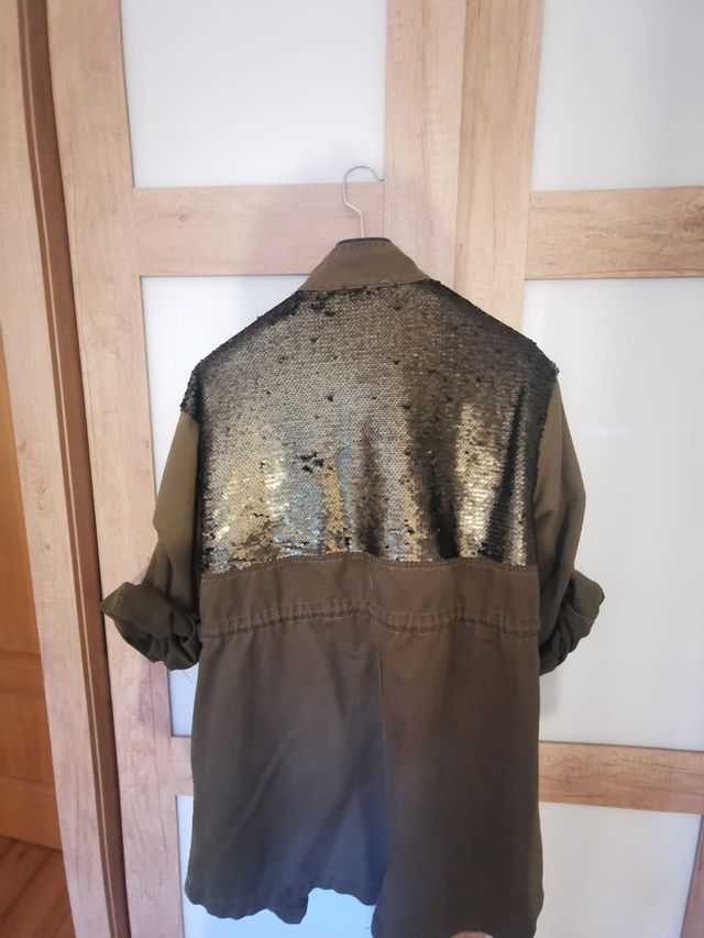 Detalles del productoSobrecamisa verde con detalle de lentejuelas en la parte superior de la espalda. Cierre con cremallera y botones de clic. Posibilidad de ceñirse a la cintura. Con bolsillos.