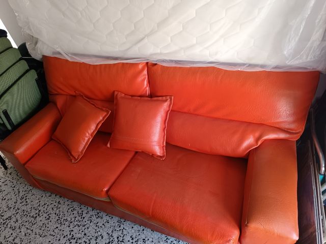 Sofa polipiel, naranja con dos cojines. Recoger en Lebrija.