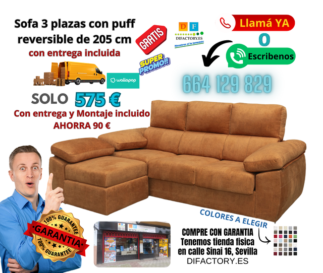 SOFA 3 PLAZAS CON PUFF REVERSIBLES