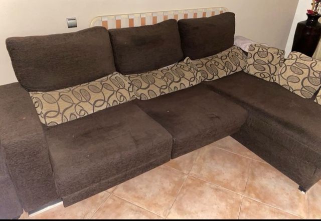Detalles del productoSofá con chaise long, asientos extensibles, y dos arcones para guardar cosas. También tiene puff reposapiés de 60x48x42 (largo ancho alto). Medidas del producto