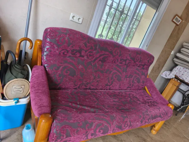 Sofá de tela y madera púrpura