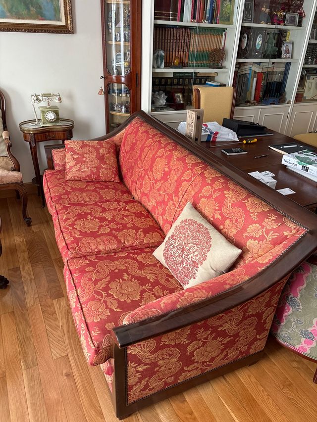Sofá tapizado floral rojo y madera