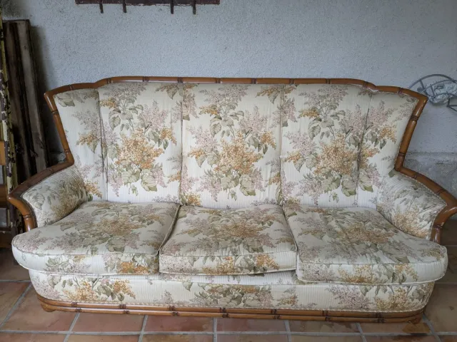 Sofá y 2 butacas de tela y madera