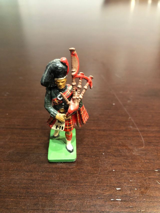 Figura de colección de un soldado de plomo tocando las gaitas. - Detallada vestimenta escocesa. - Base de color verde.