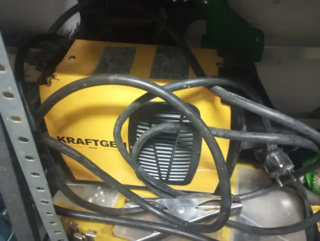 Soldador KRAFTGE de color amarillo, modelo TAiZHOU XINLAI. - Incluye pinzas y cables. - Diseño compacto.