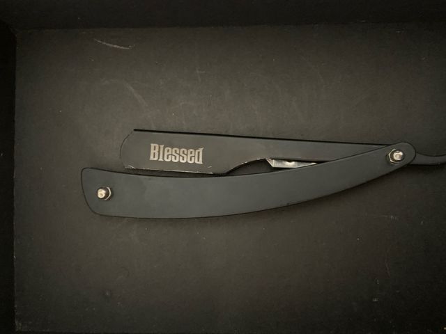Navaja de barbero clásica con mango negro y la inscripción Blessed. - Hoja de acero. - Mango de plástico negro.