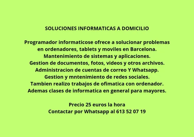 Detalles del productoProgramador informatico se ofrece a solucionar problemas en ordenadores, tablets y moviles en Barcelona. Mantenimiento de sistemas y aplicaciones. Gestion de documentos, fotos, videos y otros archivos. Administracion de cuentas de correo y whatsapp. Gestion y mantenimiento de redes sociales. Tambien realizo trabajos de ofimatica con ordenador. Ademas clases de informatica en genersl para mayores. Precio 25 euros la hora. Contactar por whatsapp al 613 52 07 19