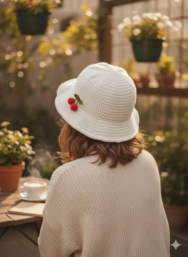 Sombrero blanco tejido con cerezas
