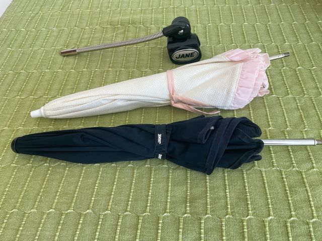 Sombrilla para carrito de bebé de la marca Jane. Incluye un soporte adaptable. - Color blanco con detalles en rosa. - Color negro.