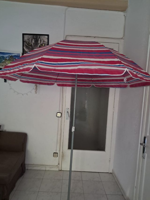 Detalles del productoPreciosa sombrilla de playa a rayas rojas, blancas y azules. Ideal para disfrutar del sol.