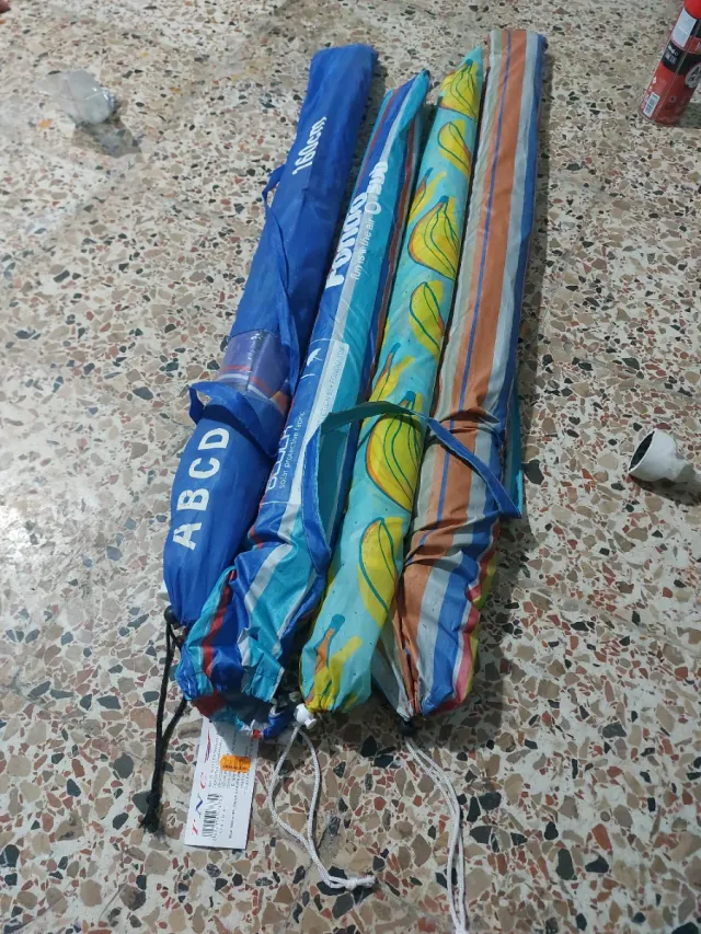 Detalles del productoConjunto de sombrillas de playa con diseño colorido y protección solar.