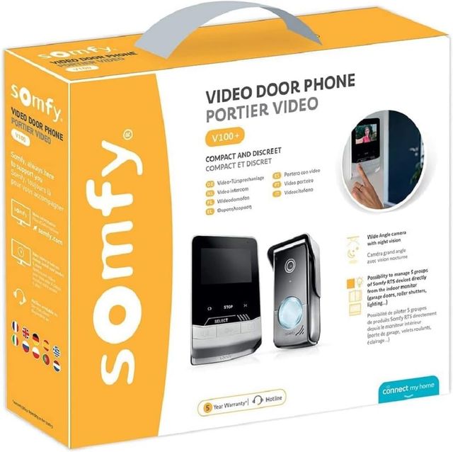 Detalles del productoSomfy 1870535 - Videoportero V100+, Videoportero 2 Hilos, con Pantalla a Color y Control RTS para persianas Somfy, Placa de Calle compacta con visión Nocturna