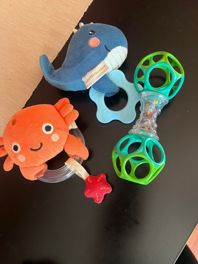Uno con forma de cangrejo naranja, otro de ballena azul, y otro verde con agujeros para agarrarlo mejor.