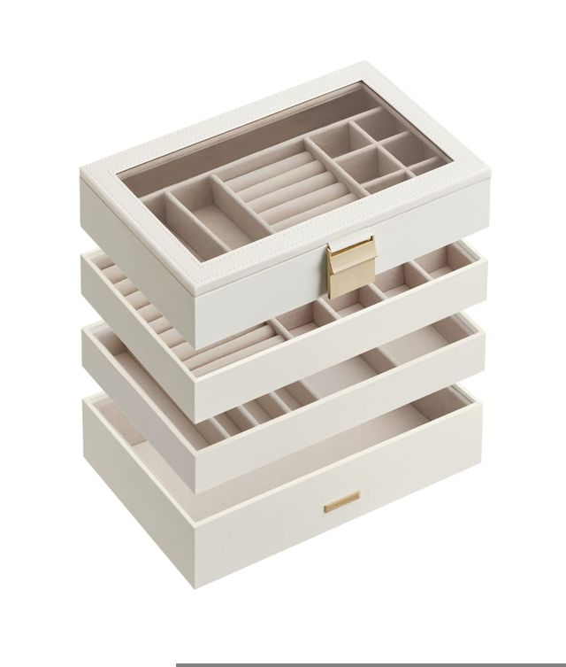 SONGMICS Caja Joyero con 4 Bandejas Apilables, Navidad, Caja de Joyas Grande, Tapa de Cristal Transparente, 17 x 28 x 18,3 cm, para Cajón de Tocador, Idea de Regalo, Blanco JBC164W01