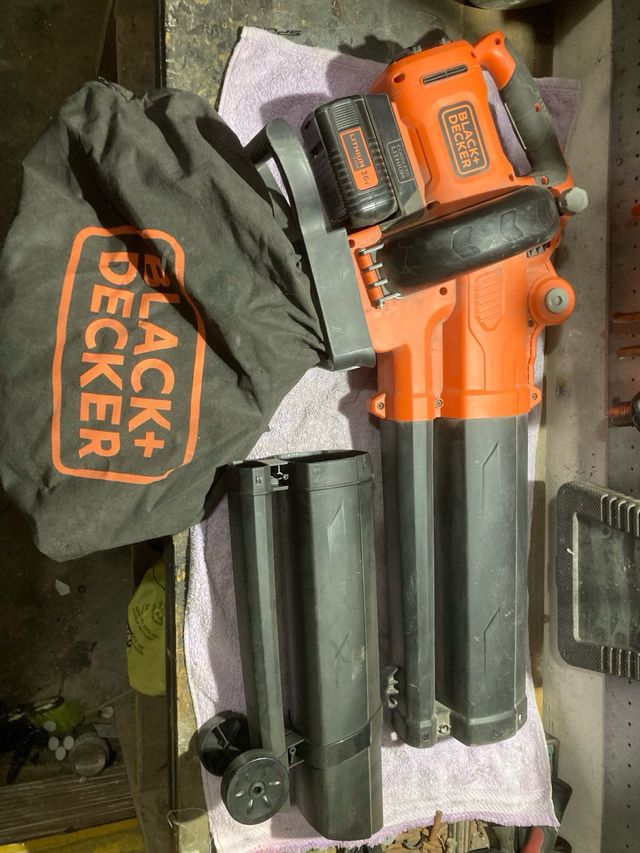 Detalles del productoSoplador y aspirador de hojas de la marca Black+Decker, funciona con batería.