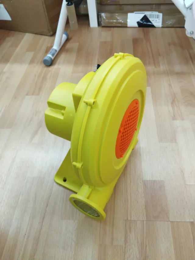 Motor soplador amarillo y naranja para castillos hinchables. - Diseño compacto y ligero. - Rejilla de protección naranja.