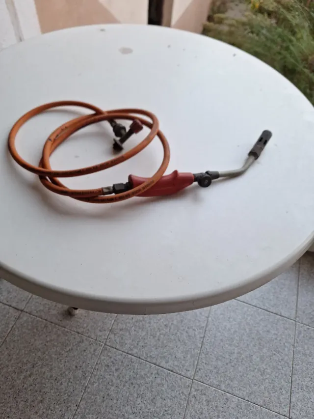 Soplete con manguera de gas para diversas aplicaciones. - Manguera de color naranja. - Empuñadura de color rojo.