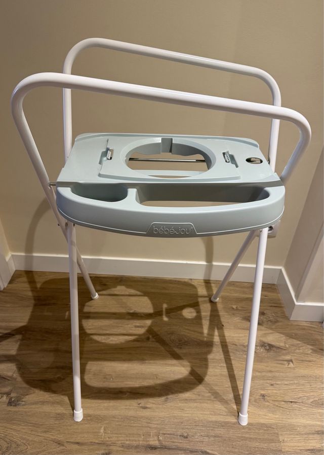 Soporte para bañera de la marca Bébé-Jou. Su diseño es ligero y fácil de montar. - Estructura metálica blanca. - Bandeja de plástico en verde cielo . - Marca: Bébé-Jou.