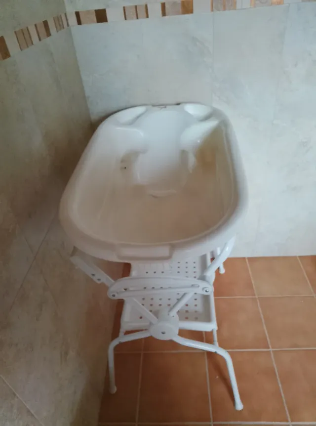 Estructura blanca para bañera y cambiador de bebé. - Bandeja con orificios. - Barras de soporte. - Patas estables.