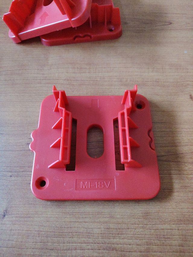 Soporte para batería en color rojo. Se encuentra en buen estado. - Compatible con baterías MI-18V. - Fabricado en plástico resistente. - Incluye un soporte.