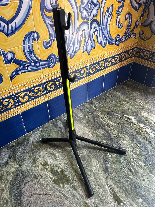 Detalles del productoSoporte para bicicleta, ideal para reparaciones o almacenamiento. Es de color negro y tiene una estructura resistente.