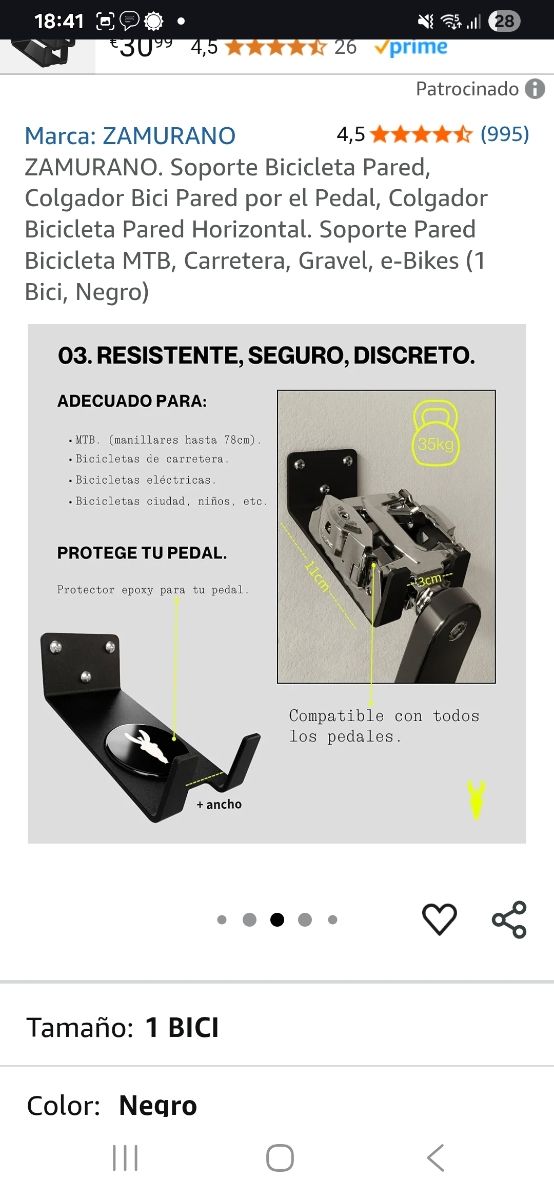 Detalles del productoSoporte de pared para bicicleta ZAMURANO, resistente y discreto. Ideal para diferentes tipos de bicicletas.