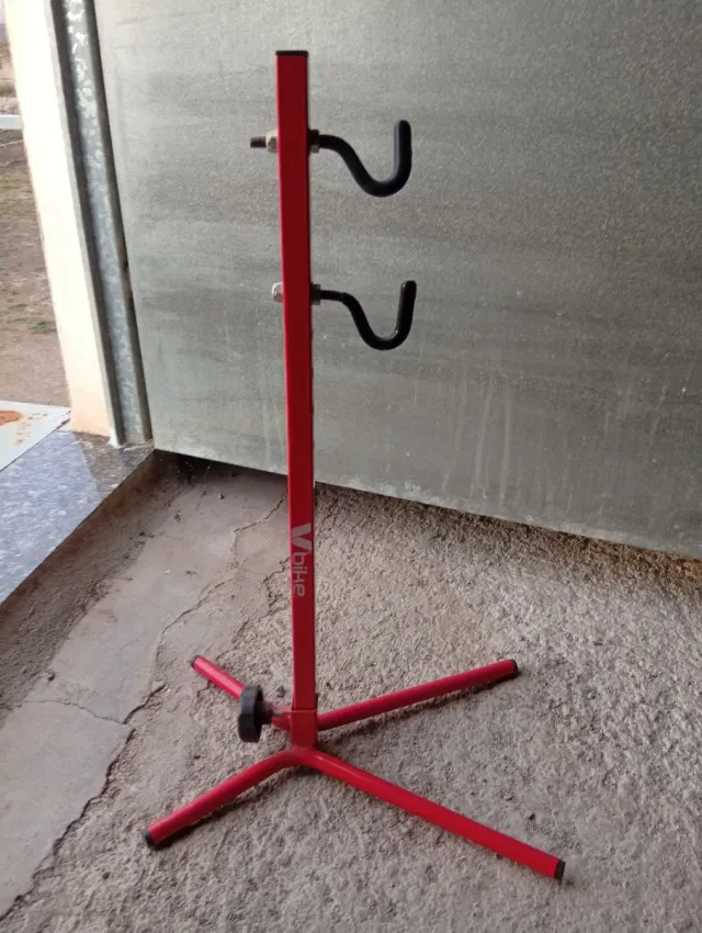 Detalles del productoSoporte de pie para bicicletas de color rojo, ideal para pequeñas tareas de mantenimiento y/o almacenamiento.