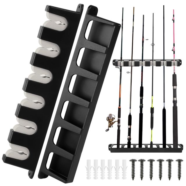Para colgar en la pared incluye tacos y tornillos también espuma para que se sujeten y no se rayen las cañas es para 6 cañas
