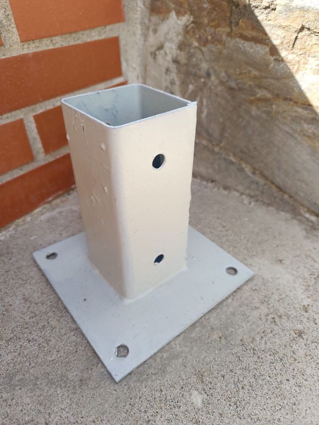 Detalles del productoTengo 12 bases de soporte de hierro, pintadas con inprimación universal, estan nuevas, la compramos por equivocación, dado que nos equivocamos con las medidas. Las vendo a 5€ la unidad (precio negociable). Base de 15x15cm y orificios de 6,5x6,5cm. Medidas del producto