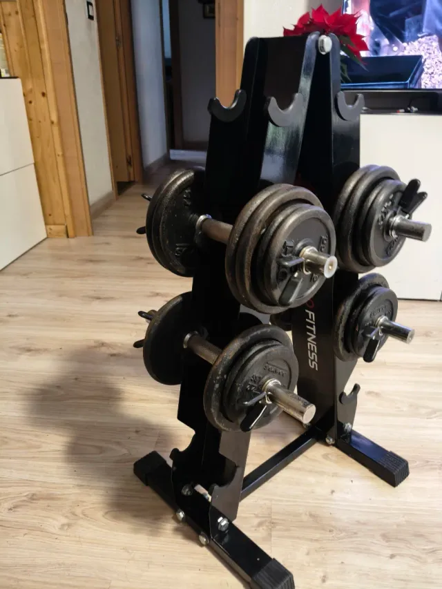 intercambiables, en total 48 kilos en 12 discos de 2 kilos, 16 discos de 1 kilo y cuatro barras de dos kilos, el soporte impecable las pesas con señales de uso.