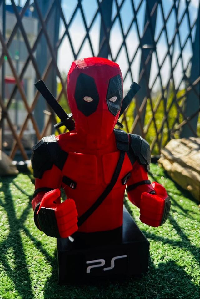 Soporte para mando de PS5 con diseño de Deadpool. - Figura detallada de Deadpool. - Base negra con logo de PlayStation.
