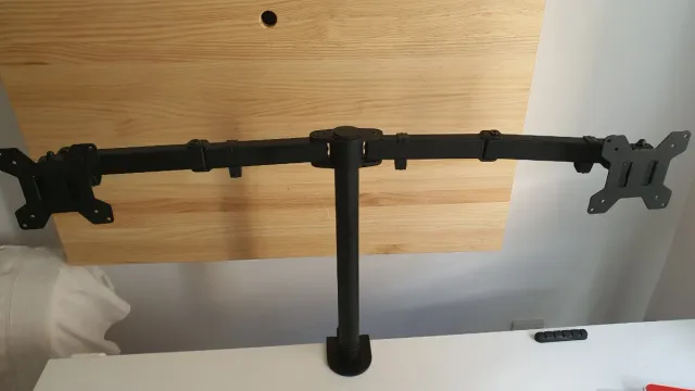 Soporte de mesa para dos monitores. Permite ajustar la posición de las pantallas.