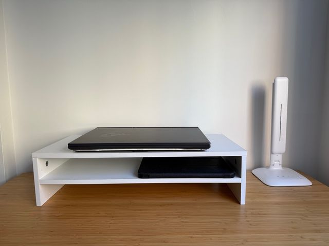 Soporte elevador de color blanco para organizar tu espacio de trabajo. - Diseño de dos niveles. - Material: Madera. - Color: Blanco.